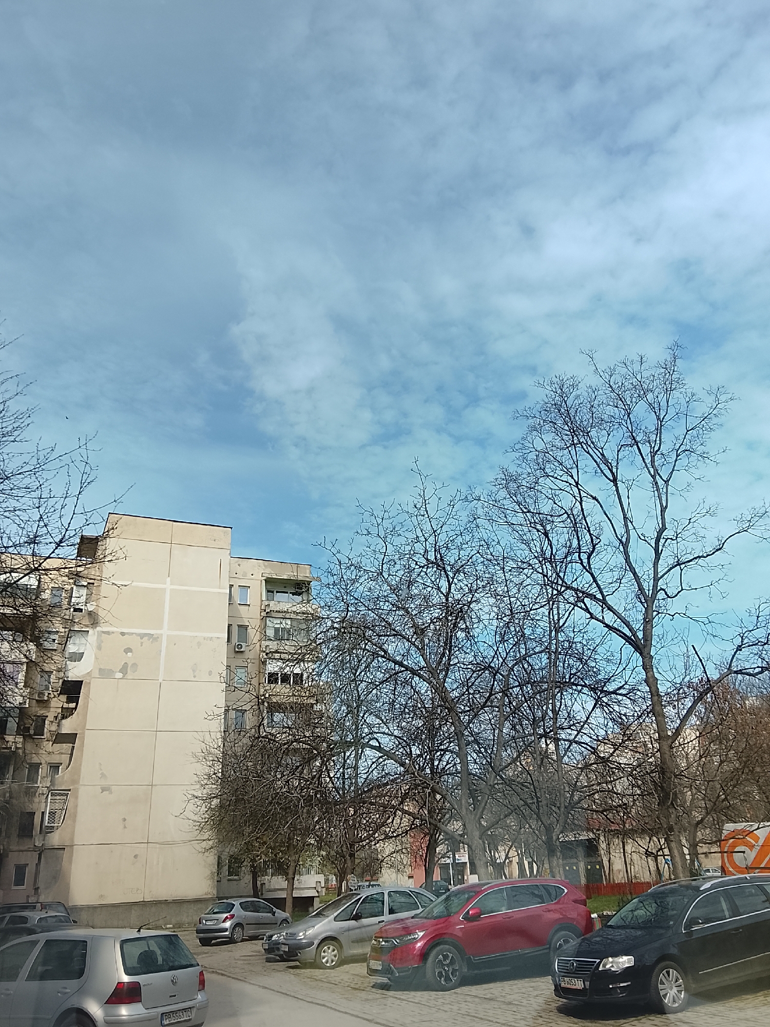 The image captures an urban scene in Plovdiv, Bulgaria, featuring a residential building complex, parked cars, and bare trees. The building on the left is a concrete apartment block with visible signs of aging and wear, marked by discolored patches and vertical lines. Another building extends behind the first. A collection of parked vehicles, including a silver Volkswagen Golf and a red Honda CRV, are visible in the foreground and middle ground. A black Volkswagen Passat is parked directly next to the Honda. The vehicles appear to be parked in a designated parking area along the street. Several bare trees dominate the scene, their branches intertwined, obscuring some of the buildings in the background. The sky is overcast with a mix of light blue and white clouds. The general environment indicates a late autumn or early spring season, given the leafless trees and diffused light. The image lacks any human figures or evident action.