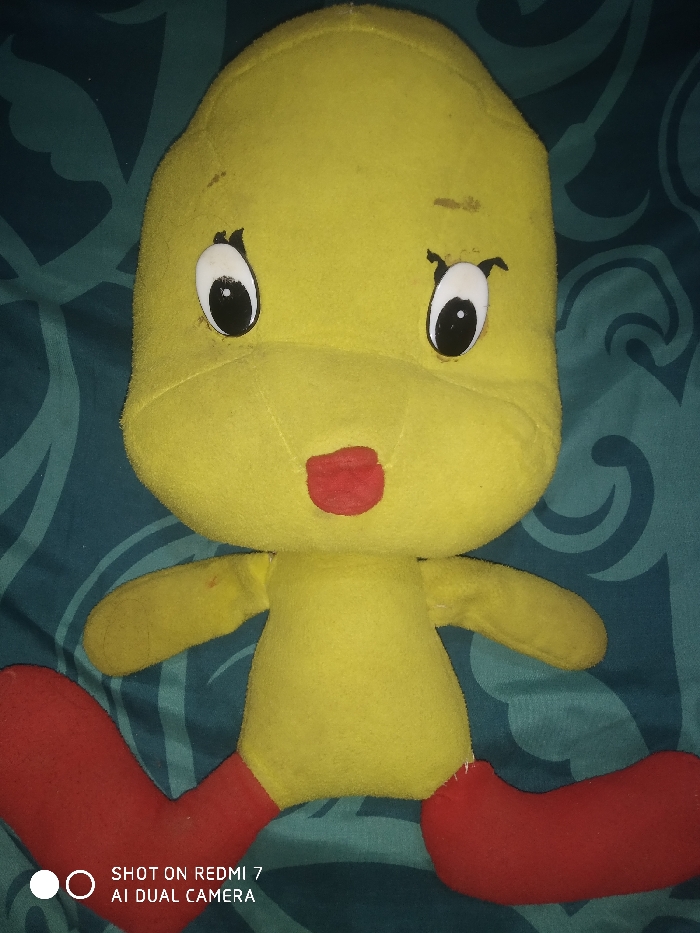 - "A yellow plush toy is centered on a dark teal fabric surface with a lighter teal stylized pattern" by FM-kh49F3, licensed under CC BY 4.0