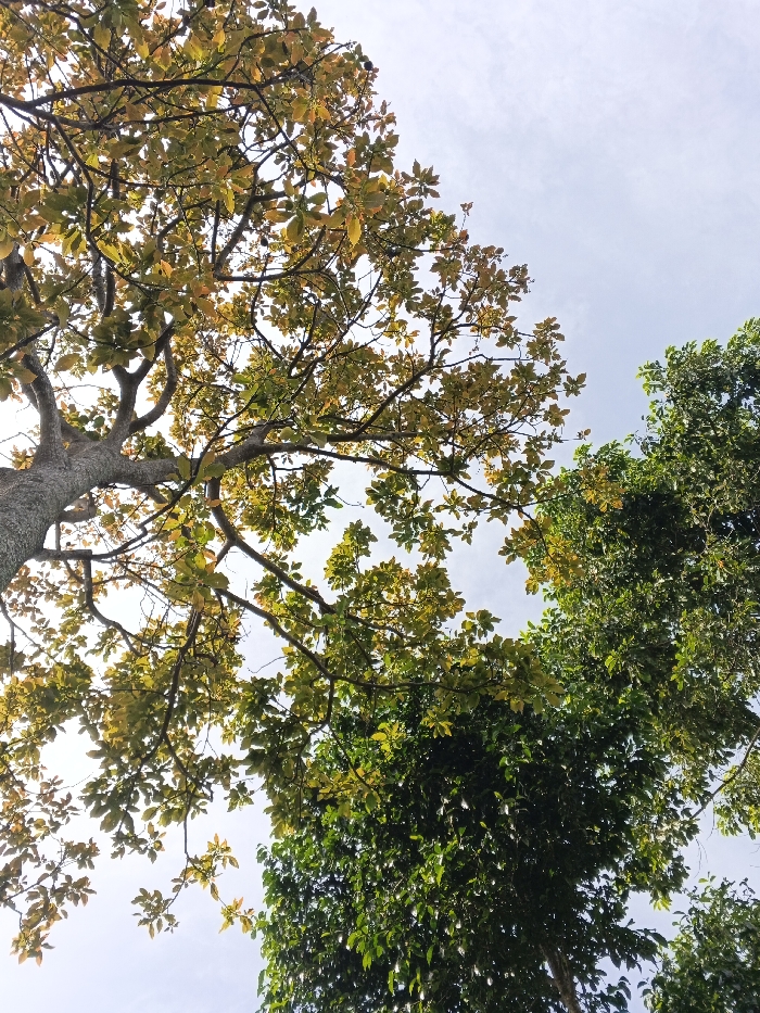 A low-angle shot captures the tops of two trees against a bright, cloudy sky. The tree on the left has a thick, light-colored trunk with branches extending upward, showcasing leaves transitioning into yellow hues. To the right, the second tree is lush with deep green foliage. The varying leaf colors suggest different species or seasonal changes. Sunlight filters through the canopy, creating a dynamic interplay of light and shadow.