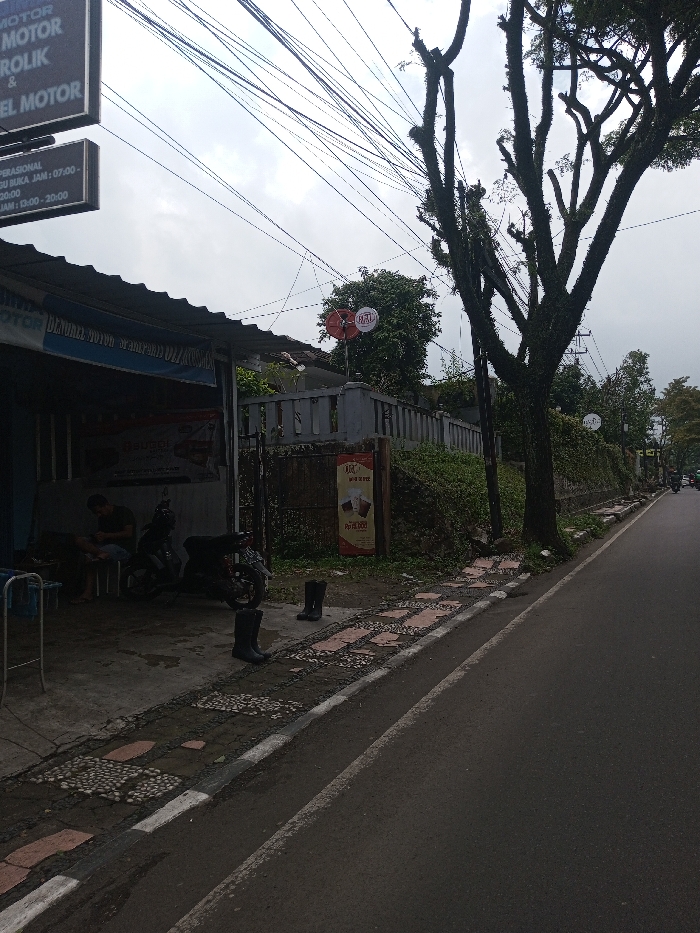 The scene depicts a roadside environment in Sandamal Eliya, Sri Lanka, under an overcast sky. On the left, a partially obscured, open-fronted structure, likely a repair shop, features multiple signs, including one indicating operational hours from 07:00 to 20:00. A dark-haired individual is seated on a stool inside the shop, engaged with a mobile device. Two motorcycles are parked to their right. Adjacent to the shop, a section of sidewalk composed of alternating brick and pebble patterns separates the road from a raised, vegetated bank. Two pairs of black rubber boots are placed on this sidewalk. A brown and white vertical poster advertising "KARE" and pricing is affixed to a dark fence at the base of the vegetated bank. Above the bank, a low concrete wall with decorative elements runs parallel to the road. Behind this wall, dense green foliage is visible. A prominent, heavily branched, leafless tree with dark, gnarled bark stands to the right of the wall. Multiple utility wires crisscross the sky above the entire scene. Further down the asphalt road, additional trees and utility poles are visible, along with indistinct figures and vehicles in the distance. A red and white spherical object marked with "BEL" is suspended by wires above the wall in the middle ground.