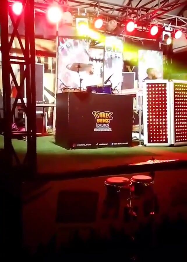 stage setup for a musical performance. There’s a black DJ booth with the logo "VEEX BENZ DRUMZ ONEMANSQUAD" on it. Behind the booth is a set of drums. To the right of the booth is a large, white, rectangular structure with an array of LED lights that display changing patterns. A person wearing a white shirt stands behind the booth and appears to be operating the equipment. In the foreground, there are two conga drums. The stage is illuminated with red spotlights and various other colored lights. The stage is covered with a green rug and is situated beneath a metal frame structure, possibly a tent.