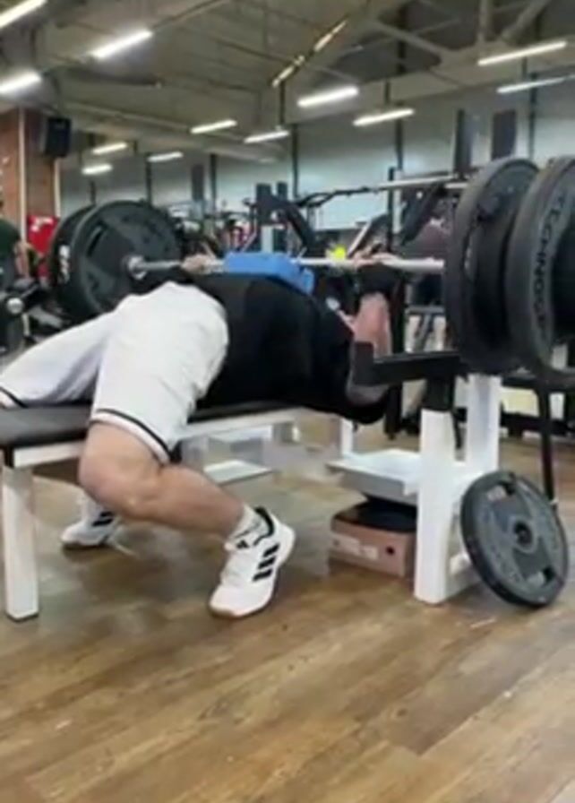 man lifting weights in a gym. He is lying on a weight bench, positioned beneath a barbell loaded with weight plates. A blue foam block sits on his chest. He is wearing a black shirt, white shorts, and white sneakers with black stripes. He lowers the barbell towards his chest and then pushes it back up. The gym has wooden flooring and other exercise equipment visible in the background. Other people are also exercising in the gym. Overhead, there are multiple fluorescent lights illuminating the space.