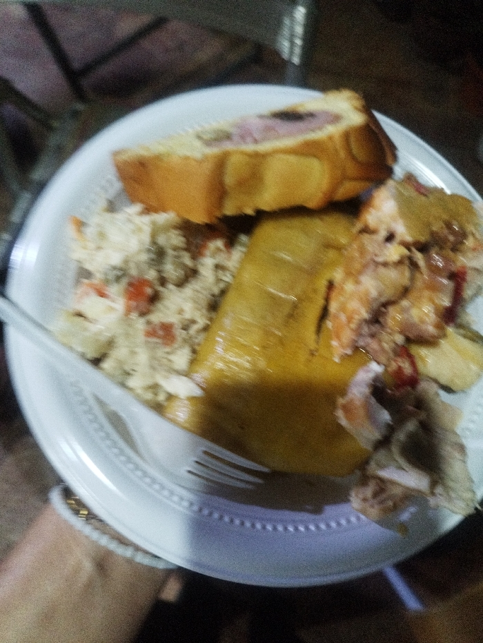 A styrofoam plate piled high with food. There's a thick slice of meatloaf-like pastry, a rice salad with diced red vegetables, a bright yellow tamale, and a portion of shredded chicken with red bell peppers and a brown sauce. A white plastic fork is on the plate, near a wrist wearing a white beaded bracelet. The plate appears to be resting on a leg, and the background is blurry.