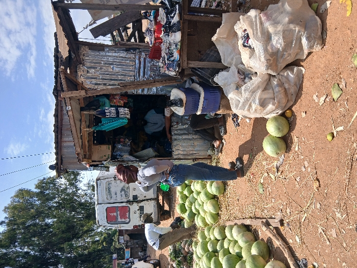 The image depicts an outdoor market scene in Vom, Nigeria, under a partially cloudy blue sky. A large quantity of light green watermelons is arranged on the reddish-brown dirt ground in the left and central foreground. A male individual, wearing a light-colored long-sleeved shirt and dark pants, is bent over near the watermelons on the left. Behind him, a white cargo van with a red-painted rear section is parked on the unpaved road. Utility lines span across the upper portion of the frame. In the center-right, a retail stall constructed from corrugated metal sheets and wooden supports is visible. Inside the stall, a male vendor in a light-colored shirt is seated, facing outward. Various items, including bags, hang within the stall. A female individual, wearing a brown headwrap, a light grey long-sleeved top, and blue jeans, stands facing the stall with her hands on her hips. Two blue and white coolers are stacked on the ground near the stall's entrance. To the right of the stall, an assortment of footwear, including sneakers and sandals, is displayed on a wooden table. The ground is composed of reddish-brown dirt, scattered with dried leaves, small debris, and a few small green fruits. In the foreground on the right, two large white mesh bags filled with what appears to be clothing or textiles rest on the ground, alongside several additional watermelons.