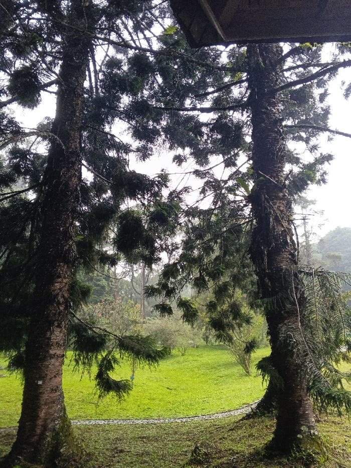 Two large trees with dense, dark green foliage frame a vibrant green meadow. A winding path of small stones cuts through the grass. Distant trees and greenery blur into a misty backdrop. The lower portions of the trees have textured bark, contrasting with the smooth, bright green of the lawn. The scene suggests a serene, natural setting, possibly a park or botanical garden. A structure with a roof edge visible above the trees suggests a nearby building.