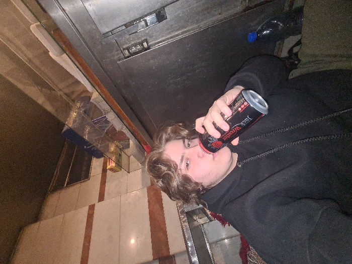 An individual, appearing male, with light brown, wavy, shoulder-length hair and a light complexion, is depicted from the chest up in an indoor setting. The individual is wearing a black hooded sweatshirt with a zipper and is in the process of drinking from a black and red aluminum can labeled "Jack Wrestler," held in the right hand. The individual's gaze is directed towards the camera. To the right of the individual, a metallic or stainless steel surface with horizontal paneling is visible, suggesting a counter or appliance. A blue plastic water bottle rests on this surface. Above the metallic surface, a clear glass shelf holds various items, including a blue object wrapped in clear plastic, other plastic-wrapped items, and a small, light-brown cardboard box. To the left, a wall section with light-colored tiles and two horizontal reddish-brown stripes is present. The environment appears to be an interior space, possibly a commercial establishment or a domestic utility area, with artificial and somewhat dim lighting. The location is identified as the city of Sarouja Municipality, Syria.
