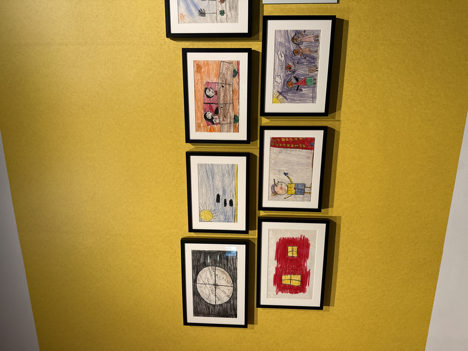 Seven framed children's drawings hang on a mustard-yellow wall