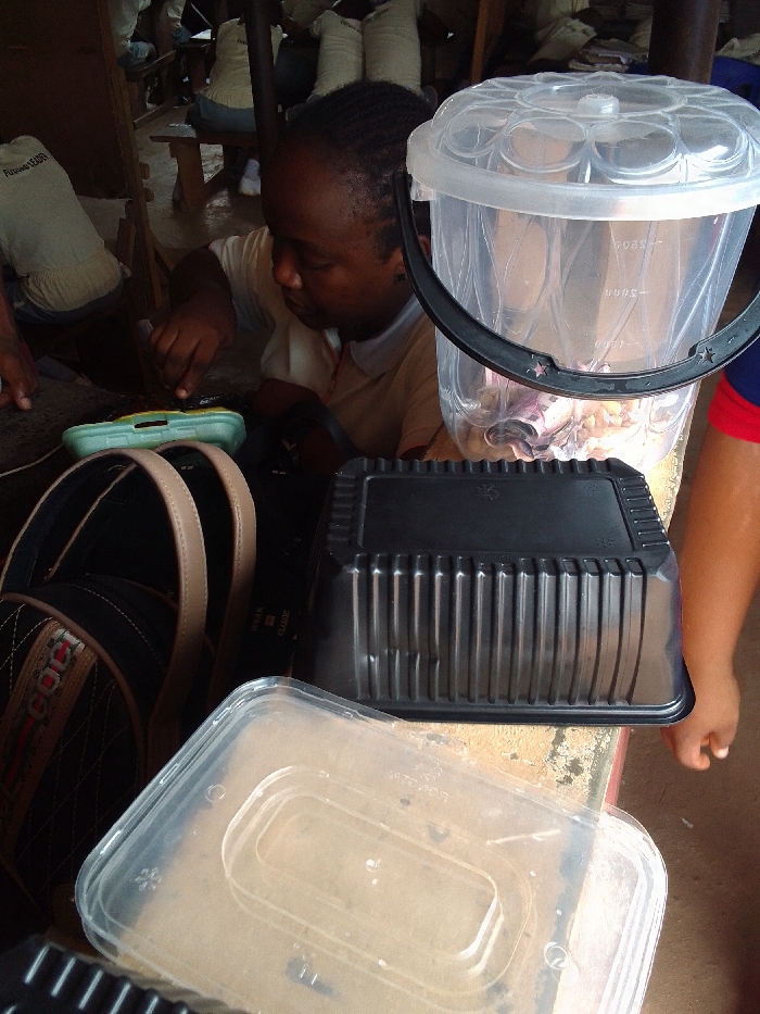 The image depicts an indoor or semi-sheltered area in the city of Unknown, Unknown. A person with dark skin and braided hair, wearing a light-colored collared shirt, is seated, leaning forward, and intently manipulating a small dark object over a light green rectangular case on a wooden table. To the immediate left, a dark shoulder bag with brown straps and "GOC" lettering is partially visible. On the table, to the right of the central figure, a black rectangular plastic container with vertical ridges is present, alongside a tall, clear plastic bucket with a black handle. This bucket contains light-colored, irregularly shaped items and displays measurement markings such as "500G." In the extreme foreground, a clear rectangular plastic container with a flat lid is partially visible. Further right, a bare arm with dark skin rests on the table. In the background, multiple blurred individuals are seated on low wooden stools. One individual in the background wears a light shirt with "SEASON LEADER" partially visible. Numerous white or light-colored sacks are stacked behind the seated figures. The floor appears to be an unpaved surface.