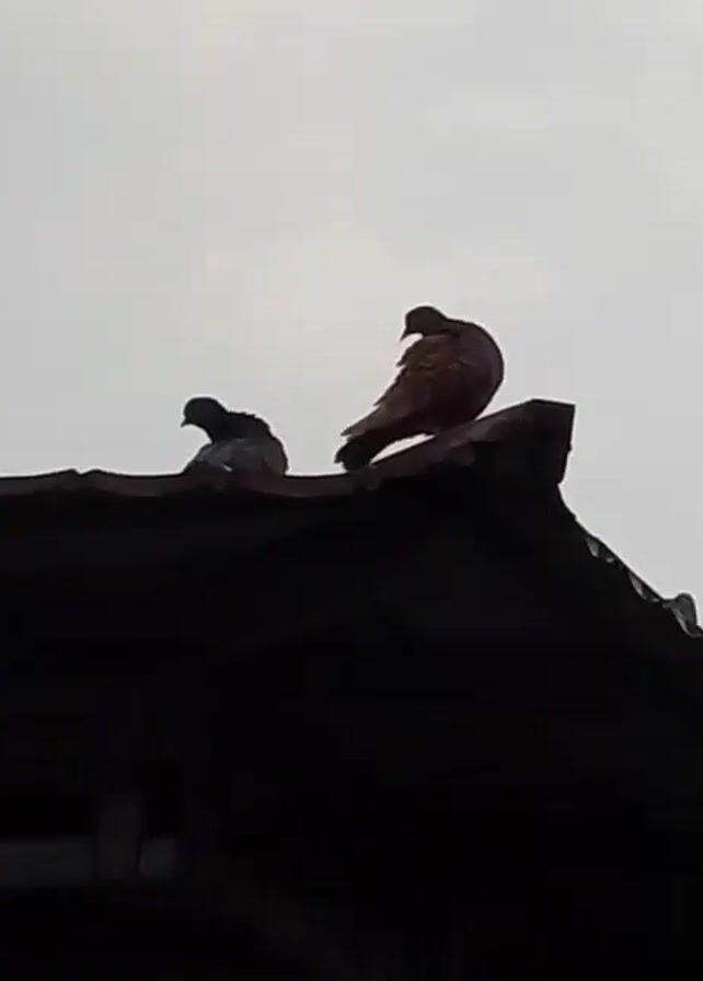 Two pigeons sit atop a tiled roof against a gray sky. The pigeons appear to be preening their feathers. The roof is in silhouette, and the overall lighting is dim.