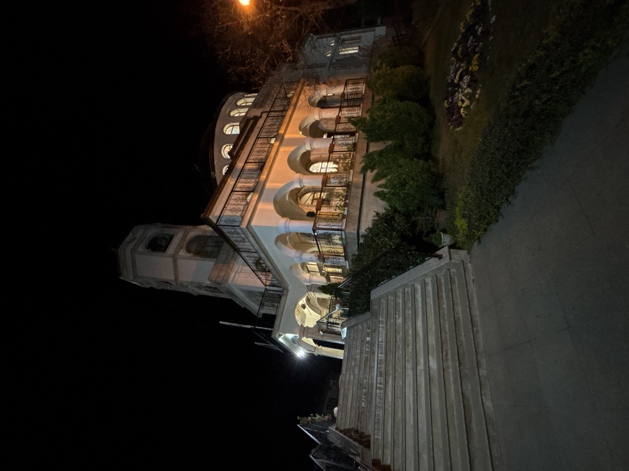 This is a nighttime shot of the St. George Church in Asenovgrad, Bulgaria. The church is illuminated, revealing its architecture, which includes arches, balconies, and a tower. A stairway leads up to the church entrance. There's landscaping with bushes and flowers along the side. The sky is dark and the overall lighting is dim, highlighting the building against the night.