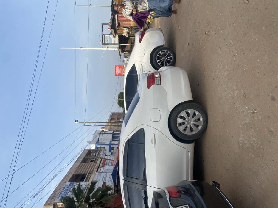 The image portrays an outdoor urban street scene in Accra, Ghana, likely within or adjacent to a public transport terminal given prominent "COASTER BUS DRIVERS" signage. The ground is unpaved, consisting of packed dirt and small stones. Three sedans are parked: a black sedan partially visible on the far left, a white Toyota Yaris sedan in the mid-ground left, and a second white sedan with alloy wheels in the mid-ground right; all are oriented away from the camera. On the far right, an adult female with dark complexion walks leftward. She wears a light-colored plaid shirt, a long blue skirt, and light brown shoes, carrying purple fabric in her left arm. Her gaze is directed downward and to her left. The background features multi-story buildings along the left side of the street, displaying various signs including "COASTER BUS DRIVERS CO-OPERATIVE, ACCRA, GHANA," "GHANA NATIONAL ASSOCIATION OF PRIVATE SCHOOLS," and an "INTERNET CAFE." A green palm frond is visible on the far left, and a blue-and-white striped awning extends from a building. Overhead, numerous utility wires crisscross a clear, light blue sky. In the mid-ground right, a makeshift structure constructed from wood and corrugated metal is present. A tall white pole, possibly a street light, stands in the background, near a red "Pizzaman Chickenman" billboard. The scene is illuminated by daylight.