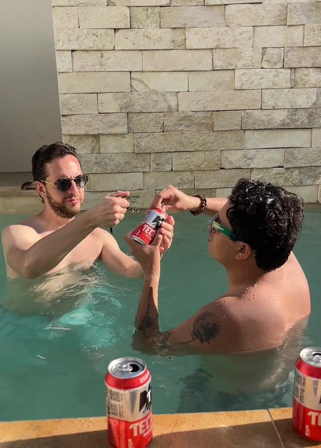 Two shirtless men in sunglasses are standing in a swimming pool, opening and drinking beer. The man on the left has a beard and is wearing dark glasses. The man on the right has curly dark hair and is wearing green-rimmed glasses. They are both standing in the water in a light-colored pool, in front of a beige brick wall. The man on the left uses a bottle opener to open the can, and the man on the right opens his beer and drinks from the can. There are three cans of Tecate beer around the men in the water.