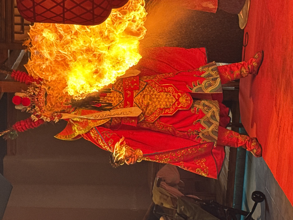 A performer in a vibrant red and gold costume projects a burst of flames. He holds a decorative sword, wearing an ornate headdress with red accents. The costume features intricate gold detailing and sweeping patterns. A red lantern hangs above, partially visible. The performance takes place on a red platform, with glimpses of backstage equipment and people at the bottom.