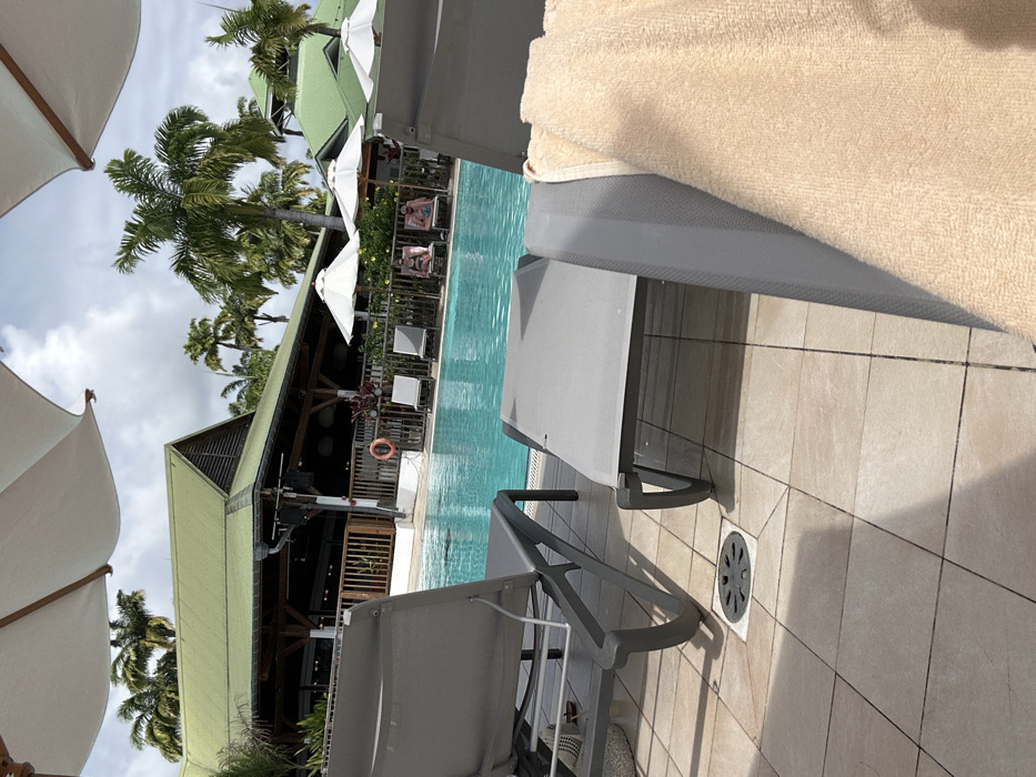 This image depicts an outdoor swimming pool area within a resort or hotel setting in Sainte-Anne, France. The perspective is low, looking across a tiled deck towards the pool and structures beyond. In the foreground, three grey lounge chairs are visible on light beige tiled flooring. A light brown towel is draped over the right armrest of the closest lounge chair, which is partially obscured on the right. Another grey lounge chair is positioned further left, facing away from the viewer, with a black circular drain grate visible in the tiles beneath its frame. A third grey lounge chair, oriented perpendicularly to the first two, shows its back and side frame on the far left, with a white sandal or flip-flop visible underneath it. White market umbrellas are partially visible providing shade overhead in the upper left and right corners. The midground features a turquoise-blue swimming pool. Beyond the pool, several additional grey lounge chairs are arranged along the poolside. Two individuals are seated on lounge chairs under white parasols to the right of the pool's center. One person is wearing dark swimwear, and the other is partially obscured. A red lifebuoy hangs on a white structure near the pool's edge, adjacent to a wooden railing. In the background, a large building with a green, multi-pitched roof is prominent on the left. It features an open-air design with dark wooden support beams and railings. External speakers are mounted on the building's facade. Numerous tall palm trees with green fronds are scattered across the background, and another building with a green roof is partially visible on the far right. The sky overhead is partly cloudy, with patches of blue visible.