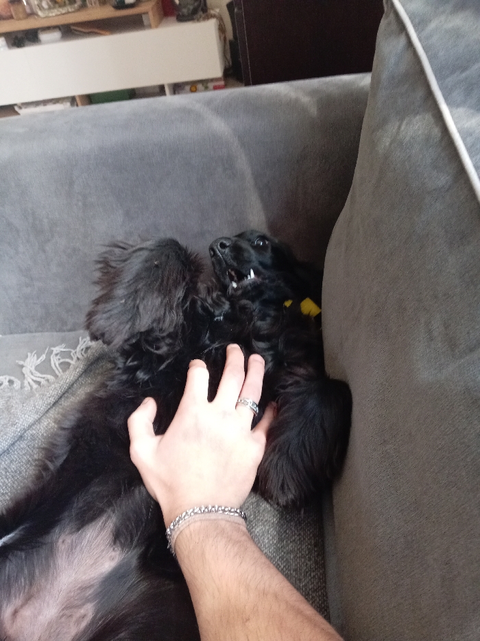 - "An indoor scene in Vetren Dol, Bulgaria, captures a black, medium-long-haired dog lying on its back on a grey upholstered sofa" by FM-qxCsA2, licensed under CC BY 4.0