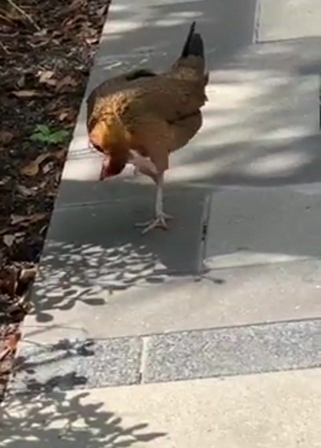 A brown chicken walks on a gray brick sidewalk. The bird has a red head and a black tail. There is brown mulch along the sidewalk. The video is shot outside in the sunshine.
