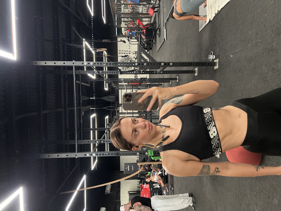 The scene depicts the interior of a gym located in Munggu, Indonesia. The primary subject is a female, appearing to be in her twenties, positioned in the foreground, taking a self-portrait with a dark-colored smartphone held in her right hand. She has light brown hair pulled back, is wearing a black sports bra with a white "New Balance" logo band, black leggings, and yellow neckband earphones with earbuds inserted. Tattoos are visible on her left upper arm/shoulder area and her right forearm. Her left arm is slightly bent at the elbow. The gym environment features dark, rubberized flooring, black walls, and a black exposed ceiling with linear LED light fixtures arranged in rectangular and square patterns. Multiple black modular power racks extend across the space, one of which supports a thick, braided climbing rope on the left. Gymnastic rings hang from a rig on the right. In the mid-ground left, a male subject with a white cap, dark tank top, and white pants is standing. Behind the primary subject, also on the left, another female in a white top is seated on the floor. To the mid-ground right, a third female in grey activewear is positioned on a white mat in a plank or push-up stance. Various other gym equipment, including cardio machines and weight benches, are visible in the deeper background, with several other individuals present and engaged in exercise. A small white cup is on the floor near a power rack post on the right.