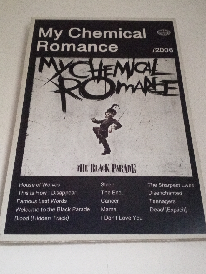 A rectangular poster, predominantly black and white with a distressed texture, is mounted on a plain white wall. The poster displays the album art and tracklist for "My Chemical Romance - The Black Parade." At the top, "My Chemical Romance" is printed in a sans-serif font, accompanied by a globe icon and "/2006." Beneath this, the band's name is rendered in a large, stylized, scratchy font. The central image depicts a skeleton figure in a drum major uniform, including a plumed hat and boots, holding a baton in a dynamic marching pose. Below the figure, the album title "THE BLACK PARADE" is inscribed in a bold, distressed font. The bottom section of the poster, set against a black background, lists fourteen song titles in three columns, such as "House of Wolves," "Welcome to the Black Parade," and "Dead! [Explicit]." The wall behind the poster is white, with minimal visible texture. The image was captured in Unknown, Indonesia.