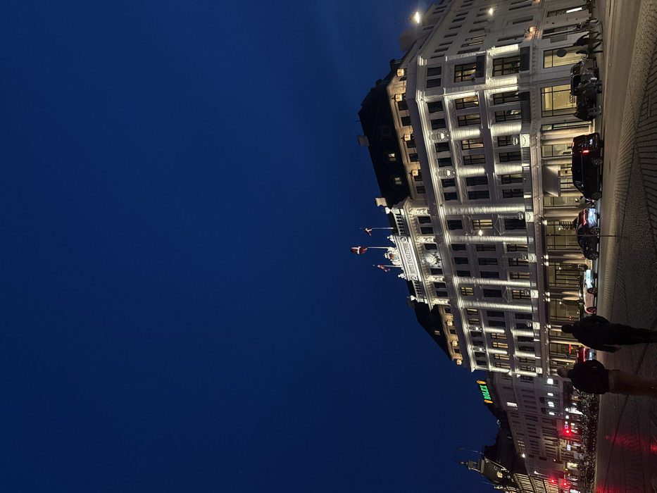 - "An evening street scene in Copenhagen, Denmark, displays the illuminated facade of the Hotel d'Angleterre on Kongens Nytorv" by FM-6Mjbf2, licensed under CC BY 4.0