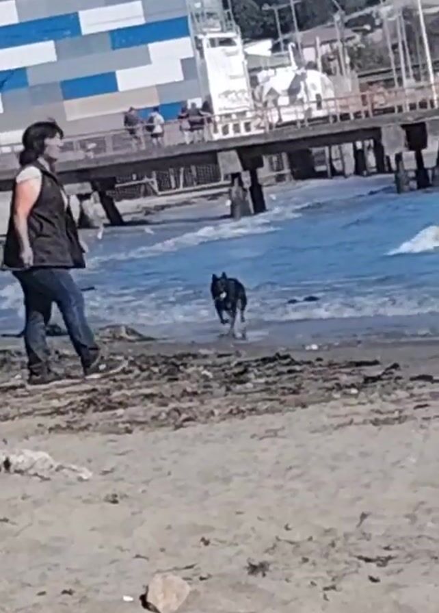 - "A woman in jeans and a vest is playing fetch with a black dog on a beach" by FM-qdi2w1, licensed under CC BY 4.0