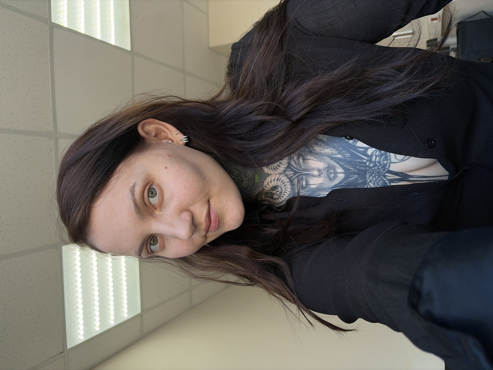 The scene is an interior shot within the city of Chaikovsky, Russia. A single female subject, appearing to be a young adult, is depicted from the chest up, facing the camera directly. She possesses long, dark brown hair, fair skin, and light-colored eyes. A mole is present below her right eye. Her left earlobe is adorned with three distinct silver-toned earrings: a single stud, a small hoop, and a stack of three small hoops. Extensive black and grey tattoos are prominent on her throat and central chest area. The throat tattoo exhibits an intricate pattern, while the chest tattoo features a stylized facial rendering above additional geometric or organic designs. She is dressed in a black, textured, long-sleeved garment, partially unbuttoned to expose the chest tattoo. The background reveals a suspended ceiling constructed from white square acoustic tiles, with multiple rectangular LED light panels providing illumination. Walls are a uniform, light-toned color.