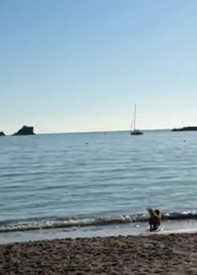 A small dog is walking along the shoreline of a beach. The beach is sandy and brown, and the water is calm and blue. In the distance, there is a sailboat and a small island. The sky is clear and blue. The dog is walking along the edge of the water, occasionally dipping its paws into the waves.