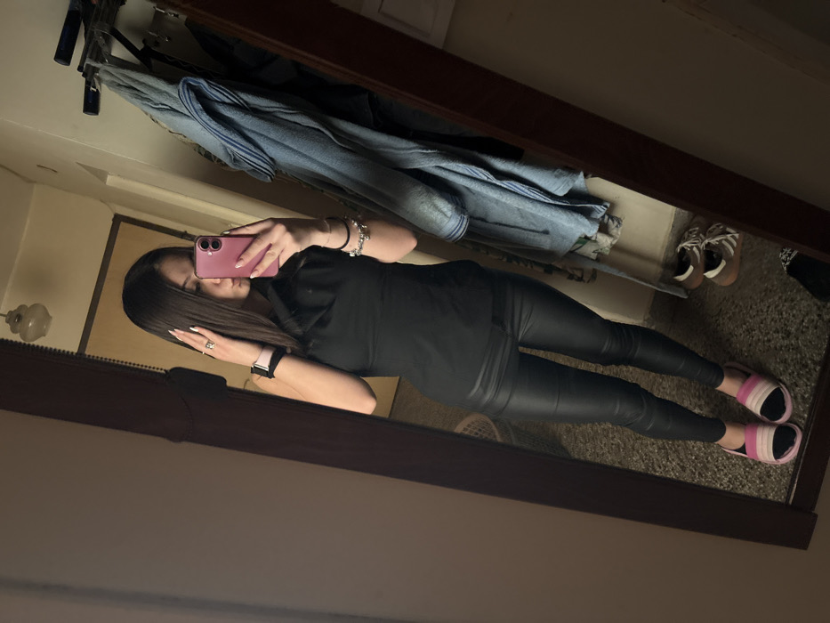 A young female is depicted in a full-body mirror selfie, taken indoors within a private residence in Radomir, Bulgaria. She has long, dark hair and is wearing a black sleeveless top with a draped neckline, black form-fitting pants, and pink and white striped slide sandals. On her left wrist, she wears a black smartwatch with a pink band and a ring on her ring finger. Her right wrist displays multiple beaded bracelets. She holds a pink smartphone with dual cameras in her right hand to capture the reflection, with her head slightly tilted and lips subtly pursed. The reflected background includes a white dome-shaped ceiling light fixture in the upper left, a light-colored doorframe, and a clothing rack on the right side laden with several garments, predominantly blue and grey fabrics. The floor, visible as a light-colored tiled surface, shows a pair of brown athletic shoes and a dark shoe near the bottom right. A white woven basket is partially visible in the far-left background.