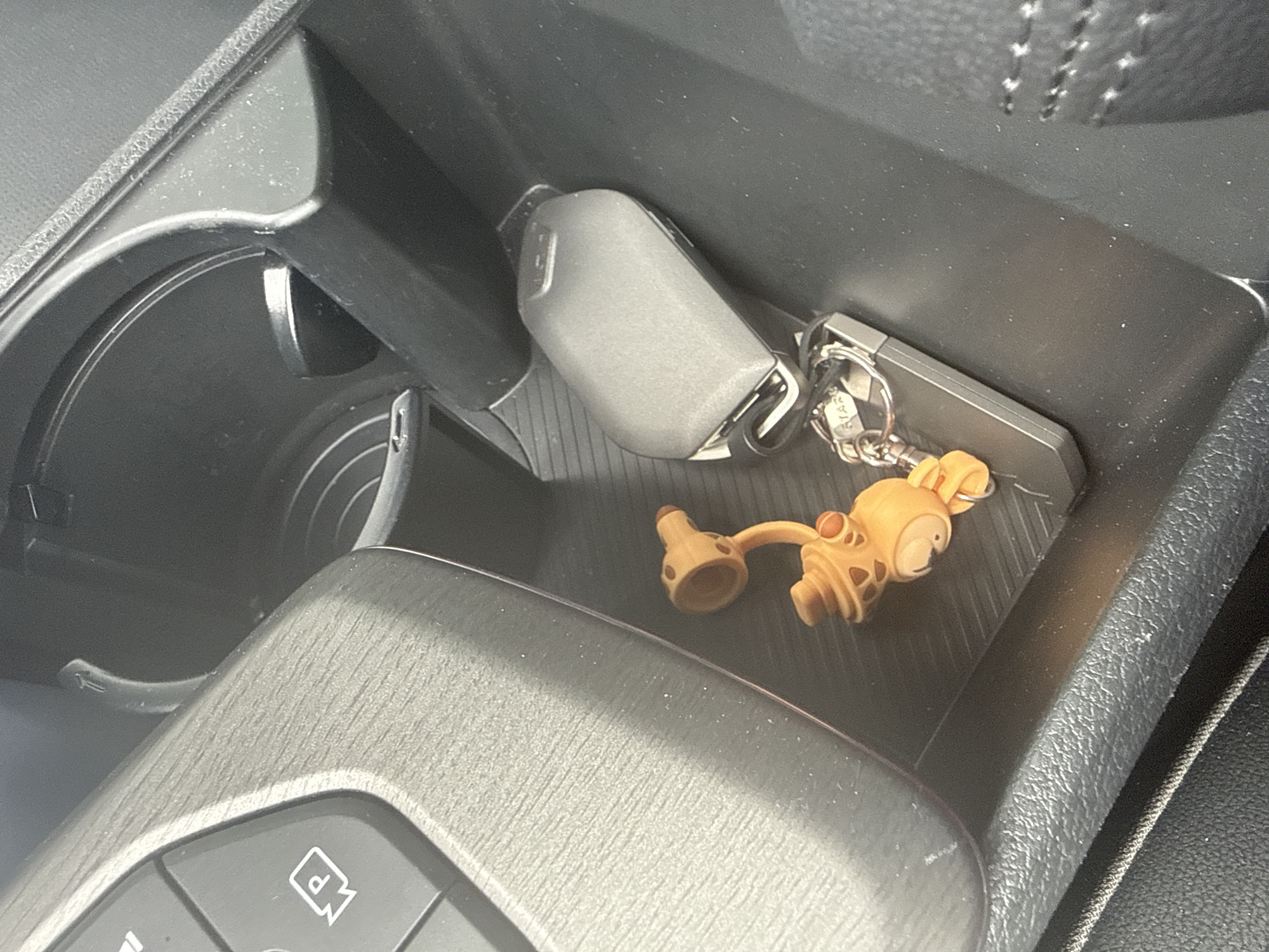 car's center console. Inside the console's storage area, there is a car key and a keychain with a giraffe figure. A cup holder is visible to the left. The console is made of black plastic with a wood-grain textured trim. The location, San Bernardino Tlaxcalancingo, Mexico, cannot be determined from the image.