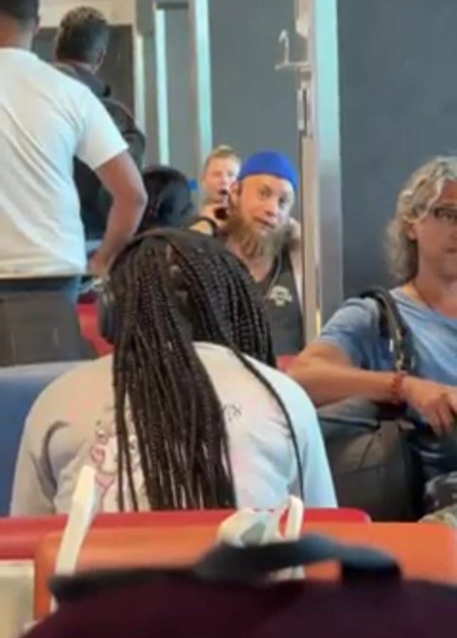 waiting area with several people sitting and standing. In the foreground, a person with long braids and headphones sits facing away from the camera. Behind them, a man wearing a blue beanie and a fake beard looks directly at the camera with an expression of amusement. A young girl stands behind the man with the beard and looks toward the camera, mouth open in what appears to be a gasp. To the right of the man with the beard, another person with curly gray hair sits and talks with hand gestures. Several other people are seen in the background, some walking and others standing. The area appears to be an airport waiting area, indicated by the seating arrangement and the presence of other travelers. The lighting is bright and appears to be from overhead fluorescent lights. The scene is observed from a seated position.