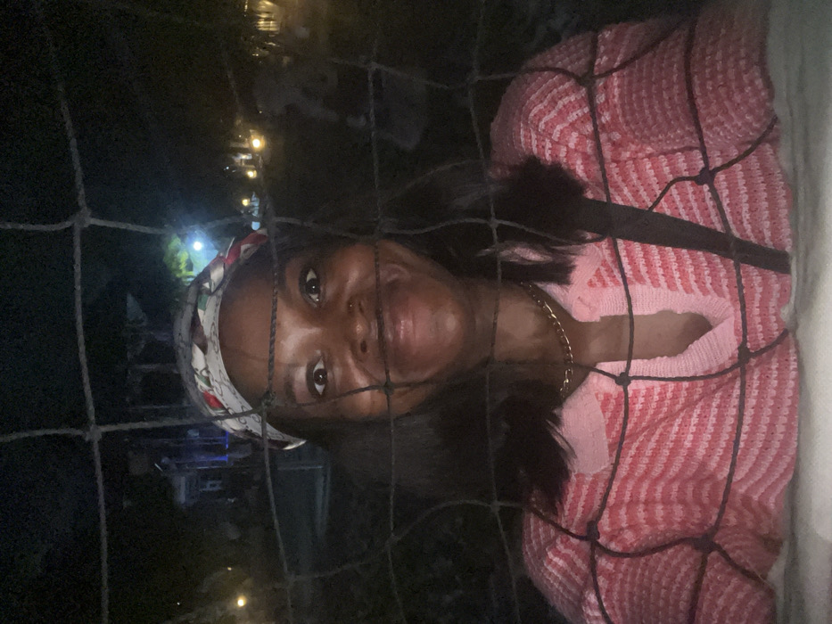 A woman with dark hair and a patterned headband peers through a wire fence. She wears a pink and white striped sweater with a low neckline, revealing a gold chain. The background is dark, with blurred lights suggesting an outdoor setting at night. The fence obscures portions of her face and clothing.