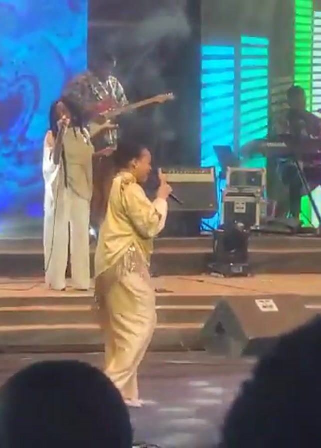 On a brightly lit stage, a woman in a gold ensemble is singing into a microphone. Two other women stand behind her in white outfits, adding backing vocals. Behind them, four men play instruments: guitar, keyboard, and another keyboard. The stage is decorated with colorful, vertical light bars. In front of the stage, the heads of audience members are visible. The scene appears to be a live musical performance.