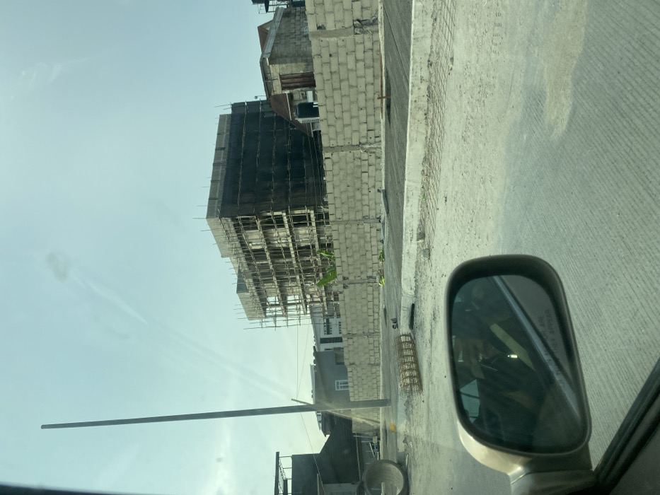 The image captures an outdoor construction scene in Alaguntan, Nigeria, under a clear, light blue sky during daylight. The perspective is from inside a vehicle, with a silver car side mirror prominently in the lower-left foreground, reflecting a partial view of an individual wearing a yellow safety vest over a dark garment. The mirror's inscription "OBJECTS IN MIRROR ARE CLOSER THAN THEY APPEAR" is legible. The immediate foreground and mid-ground consist of a light grey, unpaved or partially paved ground surface, consistent with a construction site. On this surface, construction materials are scattered: a cylindrical rebar cage lies horizontally in the mid-left, several sections of metal reinforcement mesh are laid flat, and a large grey concrete pipe or culvert section rests on its side to the far left. A low wall constructed of grey concrete blocks spans the mid-ground horizontally, separating the immediate area from the background structures. Behind this wall, some green vegetation is visible. The background features a multi-story building under active construction. Its concrete framework is visible, with extensive scaffolding (composed of poles and planks) covering its exterior. Portions of this building's facade are draped with dark netting or mesh. To the left of this central structure, a section of another building with a dark, flat roof is partially visible. To the right, a smaller, distinct building with a reddish-brown sloped roof and a black water tank mounted on its roof is present. A tall, slender grey utility pole stands vertically on the far-left side, extending upwards into the sky. No other discernible individuals are visible in the broader scene beyond the reflection in the car mirror.
