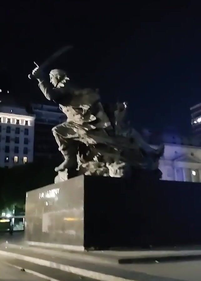 statue of a man in a fighting stance, holding a sword in his right hand above his head. The statue is set on a black pedestal, with text visible on the front that reads "JUAN AZURDUY". The statue appears to be made of stone or a similar material. The scene is shot at night, and the statue is silhouetted against the dark sky. There are buildings visible in the background, illuminated by streetlights. The camera angle is low, looking up at the statue. The ground in front of the statue appears to be a paved area with some streaks or stains on the surface. The lighting is dim, with some light reflecting off the pedestal and illuminating parts of the statue. The video is stable, with minimal camera movement.