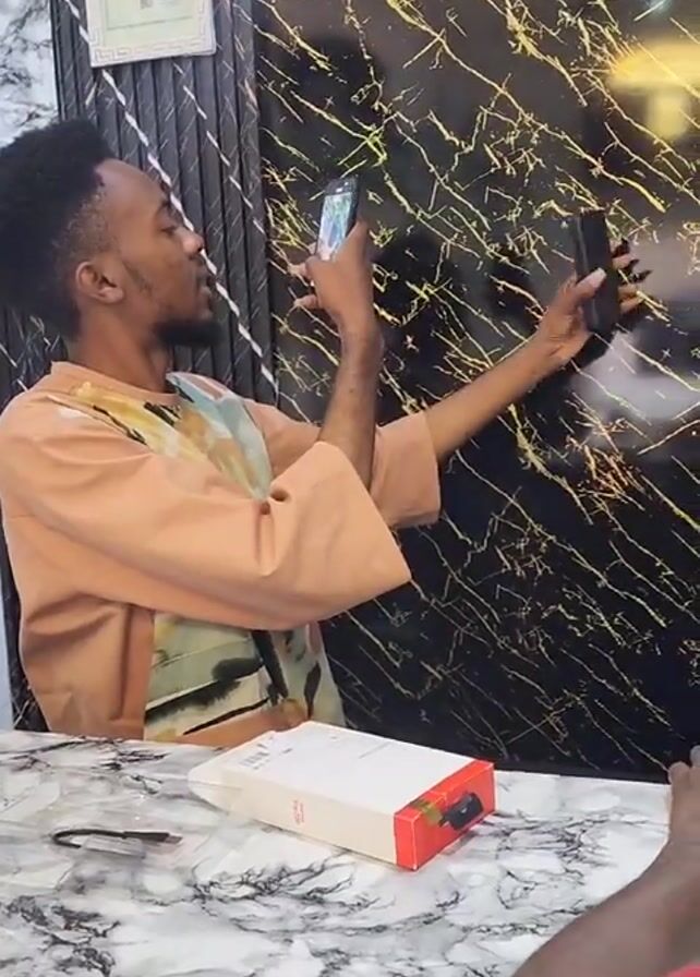 A man with short dark hair is standing behind a marble countertop. He's holding a phone in his left hand and a black phone in his right hand. He’s holding them up and taking a picture of a wall with black and gold marble wallpaper behind him. On the counter in front of him is a phone box, charging cable, and other miscellaneous items. A man in a red shirt is sitting to the right of the man holding the phones. A certificate hangs on the wall to the left of the man taking the picture.