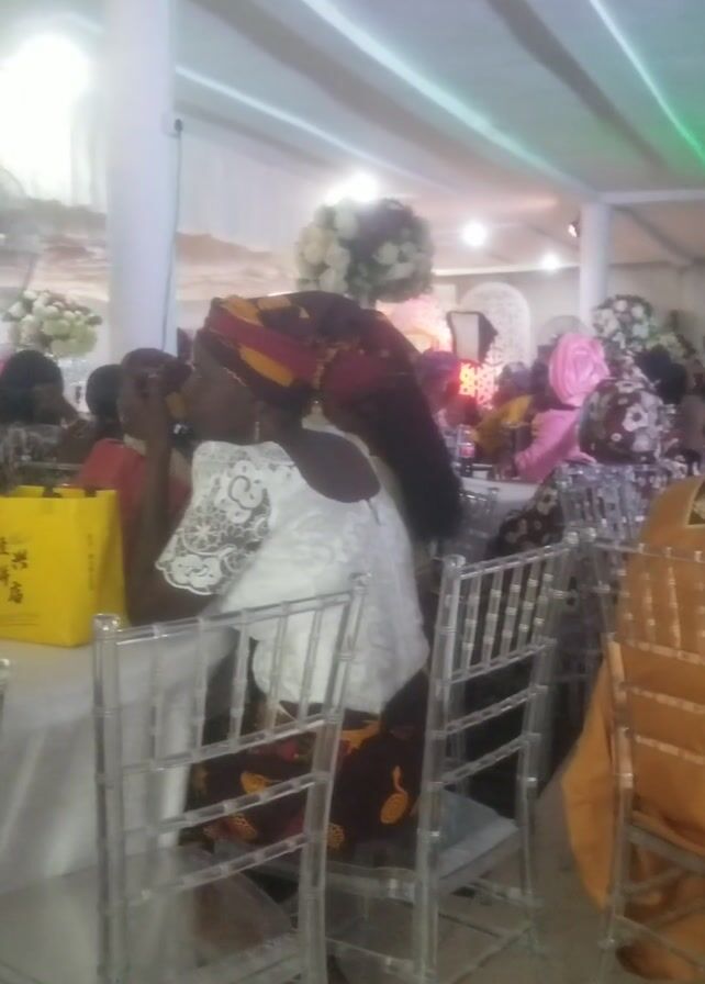Inside a brightly lit, decorated hall with a high ceiling, individuals are seated at tables arranged with floral centerpieces. The tables are covered in white tablecloths, and people are dressed in colorful traditional attire. The hall is adorned with decorative elements, creating a festive atmosphere. Some individuals are looking at their phones.