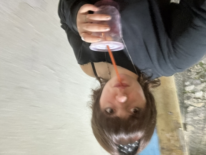A woman drinks from a clear plastic cup with an orange straw. She wears a black top and a bandana in her hair. Her gaze is directed at the camera. The background is blurred, showing a textured wall. The image has been rotated so that the woman's head is at the bottom. The photograph appears to have been taken outdoors.