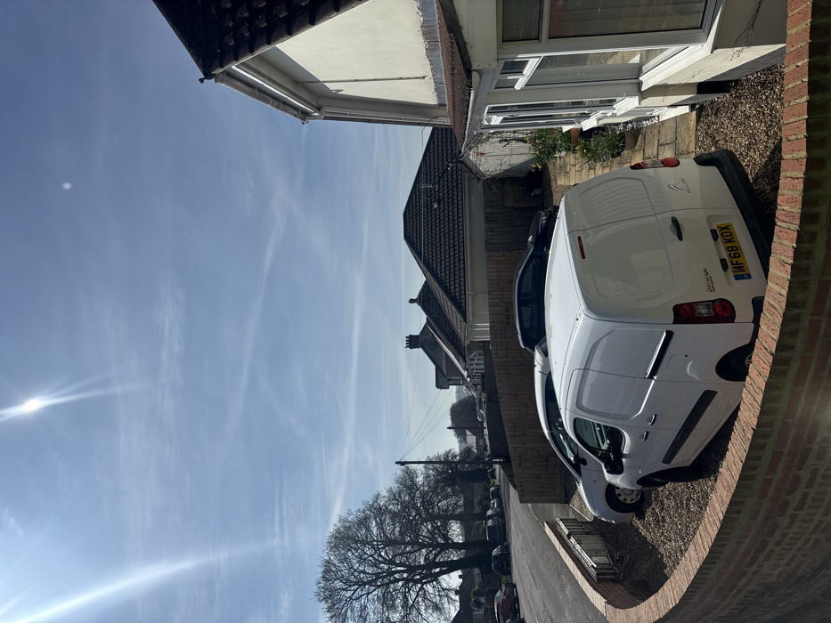 This image captures a static residential scene in Salisbury, United Kingdom, on a bright, sunny day with a clear blue sky and sparse, wispy clouds. The perspective is slightly elevated, looking over a foreground brick wall into a gravelled driveway and towards a street lined with houses and trees. In the immediate foreground, the top of a curved, reddish-brown brick wall is prominent. Beyond this wall, a gravelled driveway occupies the midground, featuring three parked vehicles. The most prominent vehicle is a white Citroen Berlingo panel van, licence plate MF68 KOX, parked with its rear facing the camera. To its left, a silver or light grey hatchback is partially visible. Further back, a dark-coloured car is also parked on the gravel. To the right of the driveway, a cream-coloured house with a dark tiled roof and a white UPVC conservatory or extension is visible. A narrow paved path runs alongside this structure, where potted plants with yellow flowers (likely daffodils or narcissus) are arranged. A light brown wooden fence separates the driveway area from the properties beyond. The background reveals a residential street curving to the left, lined with additional parked cars. Several large deciduous trees with bare branches stand prominently along the left side of the street. Beyond the street and neighbouring houses, a distant horizon with subtle landscape features is visible. Overhead utility poles and power lines traverse the scene above the street and buildings. No individuals are present, and no actions or interactions are depicted.