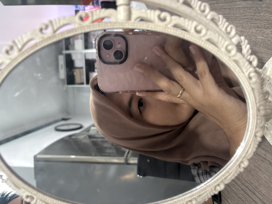 The image displays a mirror selfie captured indoors in Sidoarjo, Indonesia. The central object is an ornate, oval-shaped vanity mirror with a white or cream-colored frame, resting on a wooden surface with a visible grain. Reflected in the mirror is an individual, likely female, wearing a light brown hijab and a plaid shirt. Their right hand holds a pink smartphone with a clear, patterned case, partially obscuring the lower half of their face. The visible features include the right eye, part of the nose, and the right cheek. A plain gold-colored ring is worn on the right ring finger, and the fingernails are manicured with a light polish. The rear of the smartphone, featuring a prominent triple-lens camera system, is clearly visible. The reflected background reveals an indoor environment, indicative of an office or commercial setting. Visible elements include a dark office chair positioned to the subject's left, a large metallic cabinet or refrigerator, a dark circular wall clock mounted on a light-colored wall, and white shelving units stocked with various items such as books or boxes. In the upper left quadrant of the mirror, a partial reflection of dark hair or a head is present.
