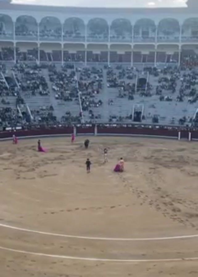 The video captures a bullfight arena filled with spectators