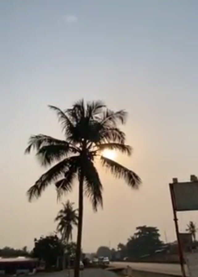 view of the sun shining behind a coconut tree. The shot appears to be taken at dusk or dawn, as the sky has a faint glow. In the background, there is a road with a few vehicles on it. There is a motorcycle parked near the bottom of the frame, next to a red curb. There is also a sign near the edge of the frame. The overall setting appears to be in a rural or tropical area.