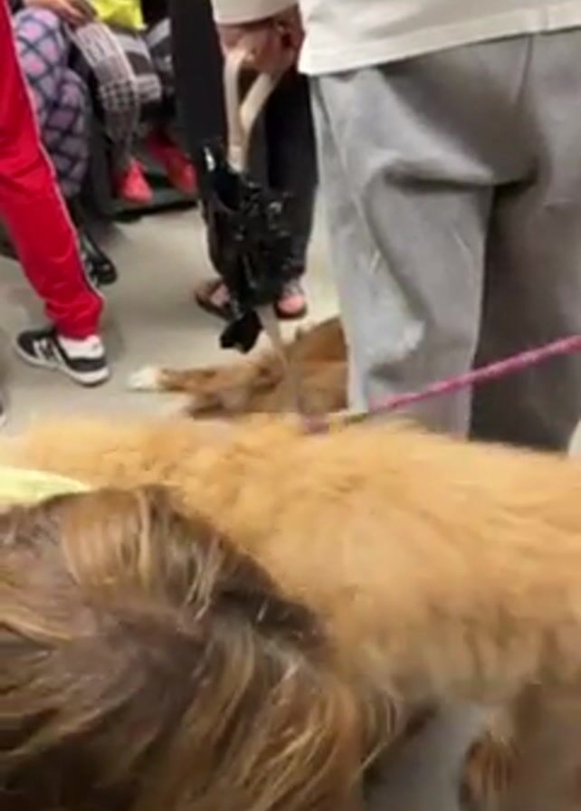 crowded room with several dogs and people. The dogs are mostly golden retrievers or similar breeds, and they are lying or standing on the floor. The people are standing or sitting, and they appear to be holding the dogs' leashes. The room is brightly lit and seems to be an indoor waiting area. There is some general conversation going on, but it is difficult to hear the specific words being spoken.