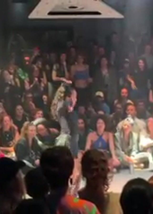 A crowded dance floor is lit with a spotlight and a disco ball overhead as two dancers take center stage. The larger crowd is seated or standing around the edges of the room, many of them filming with their phones. The dancers are both dressed in athletic wear. The dance floor is dark, and the ceiling is lit by a flat, rectangular light fixture. The crowd is diverse in age and appearance. The air looks hazy, possibly due to smoke or fog effects.