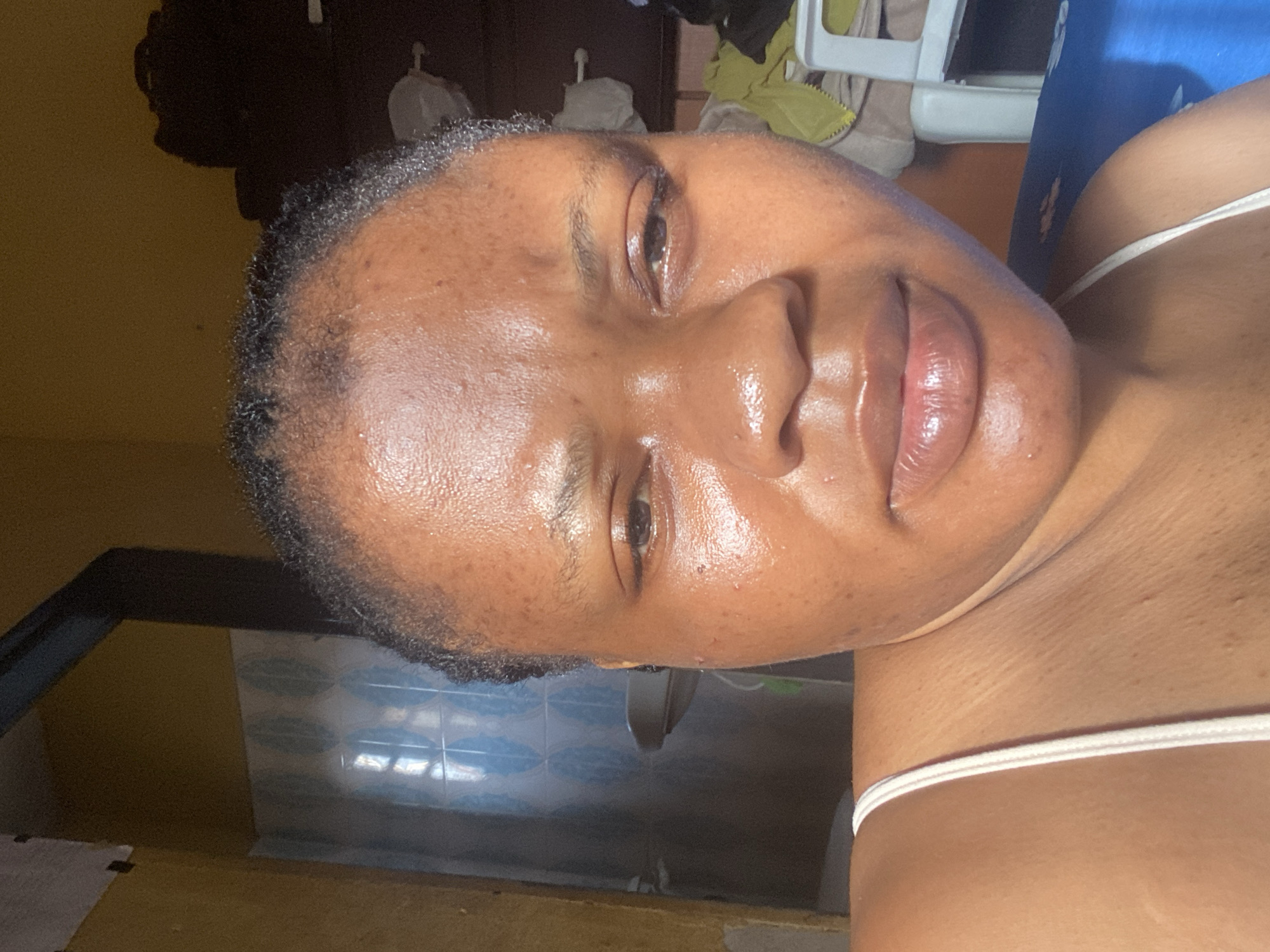 The image captures a close-up, head-and-shoulders portrait of an adult female subject within an indoor domestic setting in Narayi, Nigeria. The subject has dark skin, short, dark, textured hair, and appears to be looking directly at the camera with a neutral expression. Her skin exhibits a noticeable sheen across the forehead, nose, and chin. She is wearing a white spaghetti-strap top. The background on the left features a yellowish-orange painted wall. A doorway on the left reveals an adjacent area with walls covered in light blue and white patterned tiles, along with a partially visible white fixture, possibly a sink or basin. The background on the right includes a darker-toned wall or furniture piece, upon which several light-colored, possibly fabric, objects are placed or hung, alongside a dark item. A segment of a white plastic chair frame and crumpled yellow-green fabric are discernible in the lower right, resting on a blue surface.