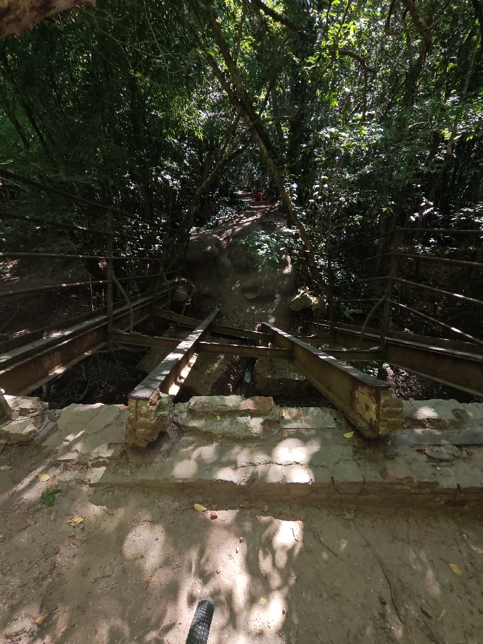 The image presents a densely forested pathway in Pereyra, Argentina, under dappled sunlight. The perspective originates from a bicycle, with the top of a tire visible at the bottom center. In the immediate mid-ground, a dilapidated bridge structure spans a narrow gully. This structure comprises a degraded brick and concrete foundation, supporting several rusty, heavy steel I-beams. Some beams are partially dislodged, resting at various angles, and appear to be part of a deconstructed or collapsed crossing. Rusty metal railings flank both sides of the gully, extending upwards into the thick vegetation. Beyond the derelict bridge, a winding dirt path ascends into the dense, green foliage, which forms a natural archway. A small, distinct red object is visible on this path in the far background, partially obscured by shadows and distance.