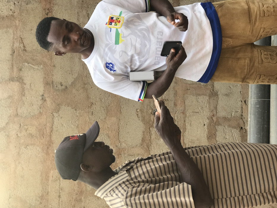Two adult males are depicted standing outdoors against a roughly textured light brown wall. In the foreground, two large dark grey pipes are horizontally positioned at the base of the wall. The male on the left, wearing a black mesh baseball cap with a red logo and a brown and beige striped short-sleeve shirt, is seen in profile, intently viewing a light-colored smartphone held horizontally in both hands. The male on the right, with a fade haircut, wears a white short-sleeve t-shirt featuring a "BB SPORT" logo, a multi-colored lion emblem, and "BAMARA" text, along with brown textured shorts marked with large "B" logos. He holds a dark-colored smartphone vertically in his right hand and a white rectangular box tucked under his left arm, while his left hand is open and empty. Both individuals are looking downwards, suggesting an interaction focused on the mobile devices. The location is an unknown outdoor setting within an unknown city and country.