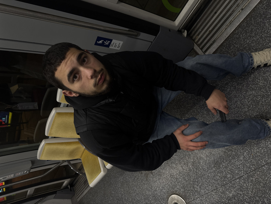 - "A young man in a black hooded jacket and light blue jeans sits cross-legged on the floor of what appears to be a train or subway car" by FM-UOLoi1, licensed under CC BY 4.0