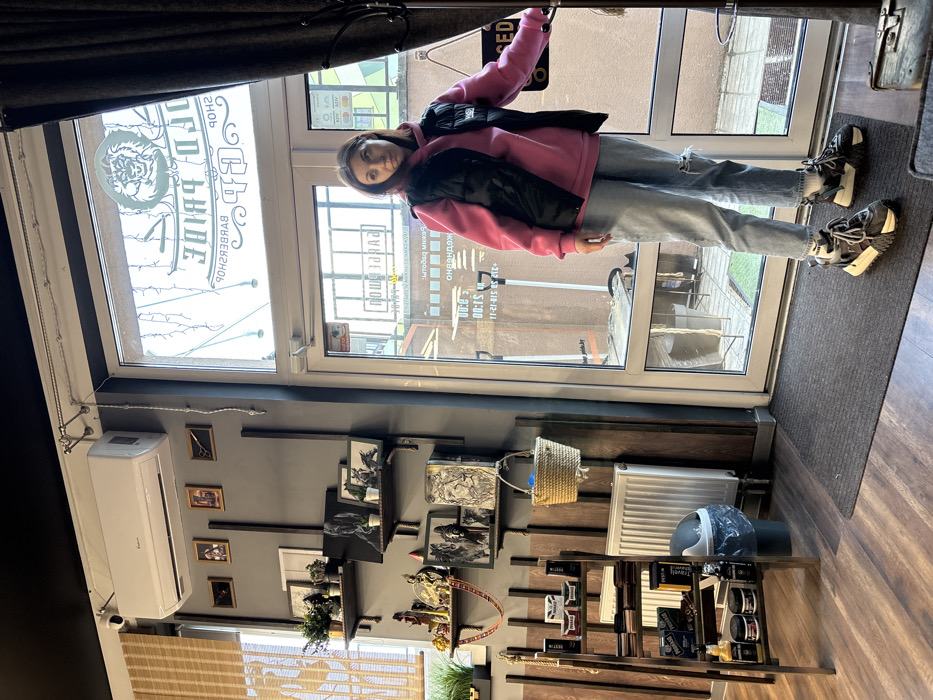 The image captures the interior entrance of the "GOLD PRIDE BARBERSHOP" in Minsk, Belarus. This identification is confirmed by the reversed text "GOLD PRIDE BARBERSHOP" and a lion logo on the upper glass panel of the entrance door, along with displayed operating hours (Mon-Fri 11-21, Sat-Sun 11-18) and a ".BY" domain on the lower part of the door. A single female subject stands facing forward in the foreground, positioned centrally within the door frame. She has medium-length brown hair and is dressed in a pink hooded sweatshirt, a black quilted puffer vest, light blue ripped jeans, and chunky grey and black athletic shoes. Her right hand is positioned at the white vertical door handle, where a black "CLOSED" sign hangs partially obscured. The barbershop interior features dark grey walls with multiple wooden floating shelves displaying a variety of decorative objects, including potted plants, framed artwork, and figurines, notably a golden Buddha statue on the lowest shelf. A wooden ladder-style retail display unit stands to the left, showcasing hair care products (e.g., Proraso) and small leather goods. A white split-system air conditioner is mounted high on the left wall, below which hang several small framed pictures. Other interior elements include a woven light-colored basket hanging near the center, a white panel radiator, a dark grey waste bin, a small security camera in the upper left corner, and a dark wood laminate floor leading to a grey entrance mat. A dark grey curtain is partially visible on the right, and a light-colored bamboo blind covers a window on the far left. Through the glass door, an exterior paved area is visible, with some green artificial turf on the ground and distant buildings featuring varied colored facades. Frost or condensation is present on the upper pane of the glass door, indicating cold outdoor conditions.