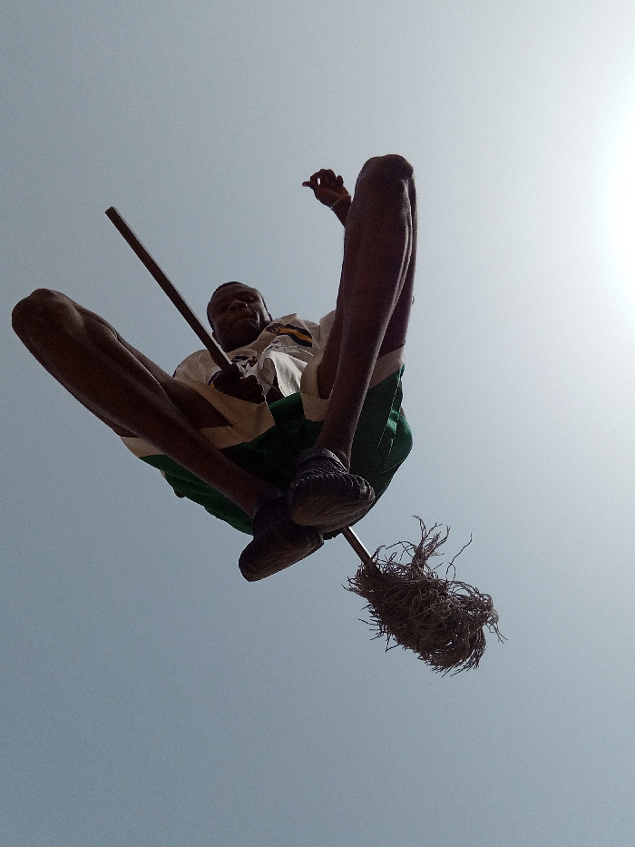 In Narayi, Nigeria, a low-angle photograph captures a young male in mid-air, appearing suspended against a bright, clear sky. The individual, dressed in a light-colored polo shirt with a dark stripe pattern and dark green shorts, is positioned centrally within the frame. His legs are bent at the knees, and his feet, shod in dark, textured footwear, rest upon the handle of a traditional broom. He holds a dark wooden stick in his left hand, angled upwards. His right hand is raised, with fingers curled, near his head. The perspective is from directly below, looking up, with the sun casting a bright glare from the upper right quadrant of the image, causing mild overexposure in that area. The broom, dark and fibrous at its head, extends downwards and to the right from beneath his feet. No other environmental details are visible beyond the unblemished sky.