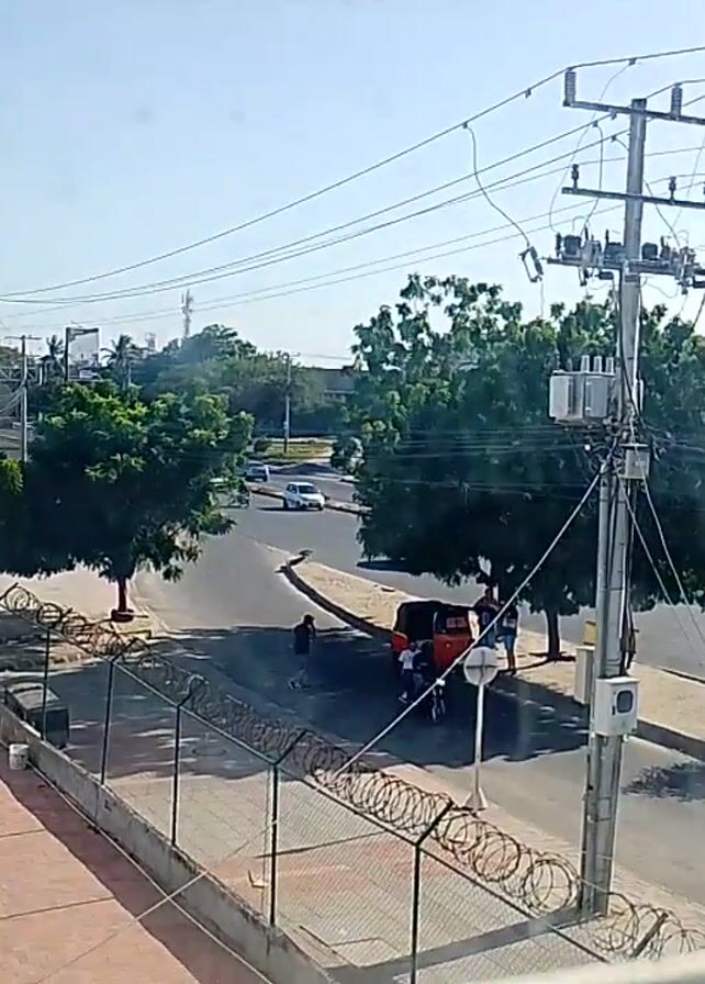 view from a high angle, likely from inside a building, looking out over a street scene. The street has light vehicle traffic, including cars and what appears to be a three-wheeled auto rickshaw. There are pedestrians walking on the sidewalks. Power lines and utility poles are visible overhead. Trees line the streets, and there are buildings of varying sizes in the background. The sky is mostly clear and blue. The foreground shows a portion of the building interior, including a window frame and parts of a wall.