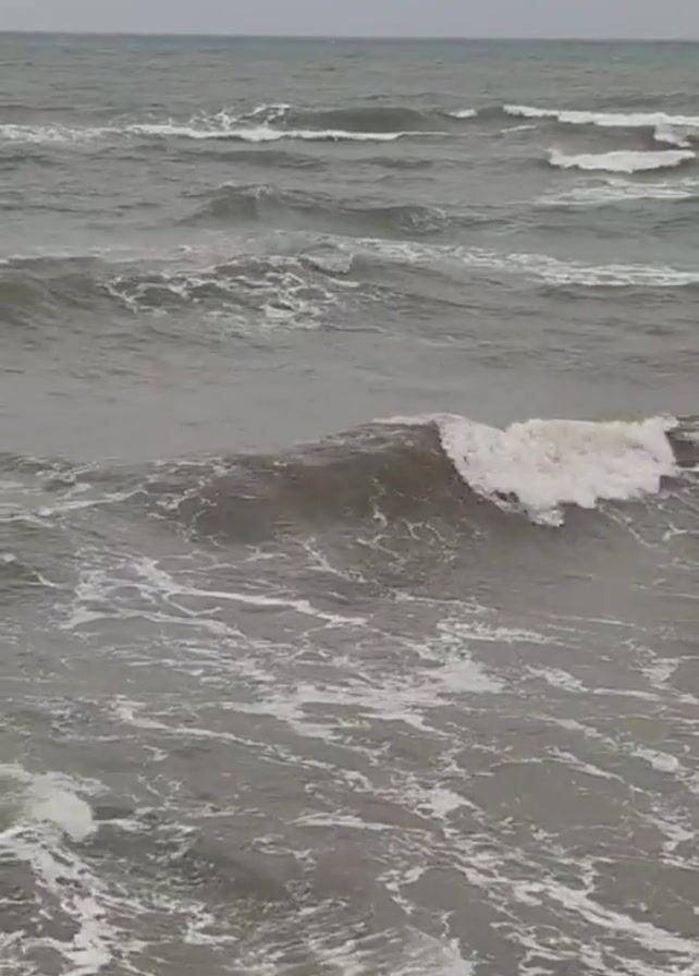 view of the sea on a cloudy day. The water is a greyish-brown color with white foam cresting on the waves. The waves are small to medium-sized and are moving towards the viewer. The horizon is visible in the distance.